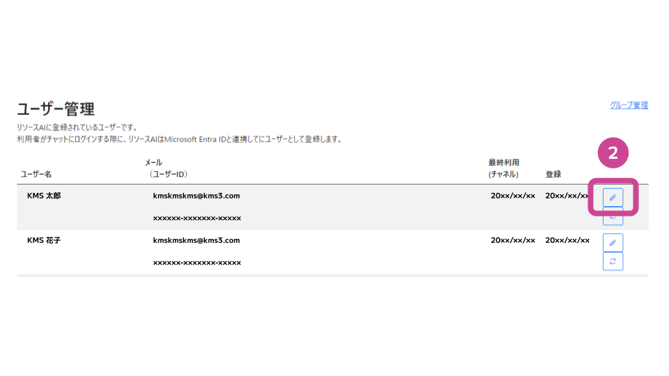 AI作成について 新しいAIを作成する場合 「AI編集」画面で設定をする場合 「AI設定」画面で設定をする場合 「テンプレート」を設定/削除する場合 「文書管理」で文書を登録する場合 「トレンドワード」を設定する場合 「禁止ワード」を設定する場合 AIが参照したデータのダウンロードを許可する場合 利用者からのフィードバックを確認する場合 トークン制限について トークン制限を設定する場合 チャット履歴について ユーザーごとのチャット履歴を閲覧したい場合 消費トークンについて 各ユーザー/システム全体の消費トークンを確認したい場合 ユーザー管理について ユーザーロールの種類について ユーザーが利用できるAIを設定する場合 ユーザーグループを新規作成、編集する場合 ユーザーが利用できるAIを設定する場合 ユーザー管理画面上で、ユーザーが利用できるAIを設定する方法を説明します。 1.管理画面のヘッダーにある「ユーザー」を選択します。 2.設定変更したいユーザーを一覧から選択します。 3.画面内の「利用可能なAI」内の[利用可能なAIを追加]を押します。 4.追加したいAIにチェックを入れて[保存]を押すと、選択したAIが利用可能になります。