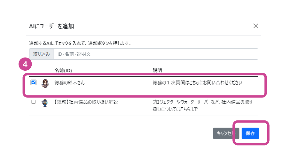 ユーザーが利用できるAIを設定する場合 ユーザー管理画面上で、ユーザーが利用できるAIを設定する方法を説明します。 1.管理画面のヘッダーにある「ユーザー」を選択します。 2.設定変更したいユーザーを一覧から選択します。 3.画面内の「利用可能なAI」内の[利用可能なAIを追加]を押します。 4.追加したいAIにチェックを入れて[保存]を押すと、選択したAIが利用可能になります。